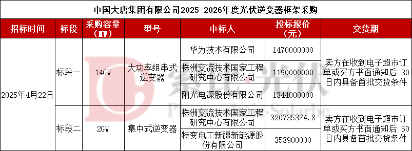 其中,标段一涵盖中国大唐集团公司所属光伏项目所用组串式逆变器,预估采购总量14GW,中标人3位:华为技术有限公司、株洲变流技术国家工程研究中心有限公司、阳光电源股份有限公司,要求卖方在收到电子超市订单或买方书面通知后 30日内具备首批交货条件。