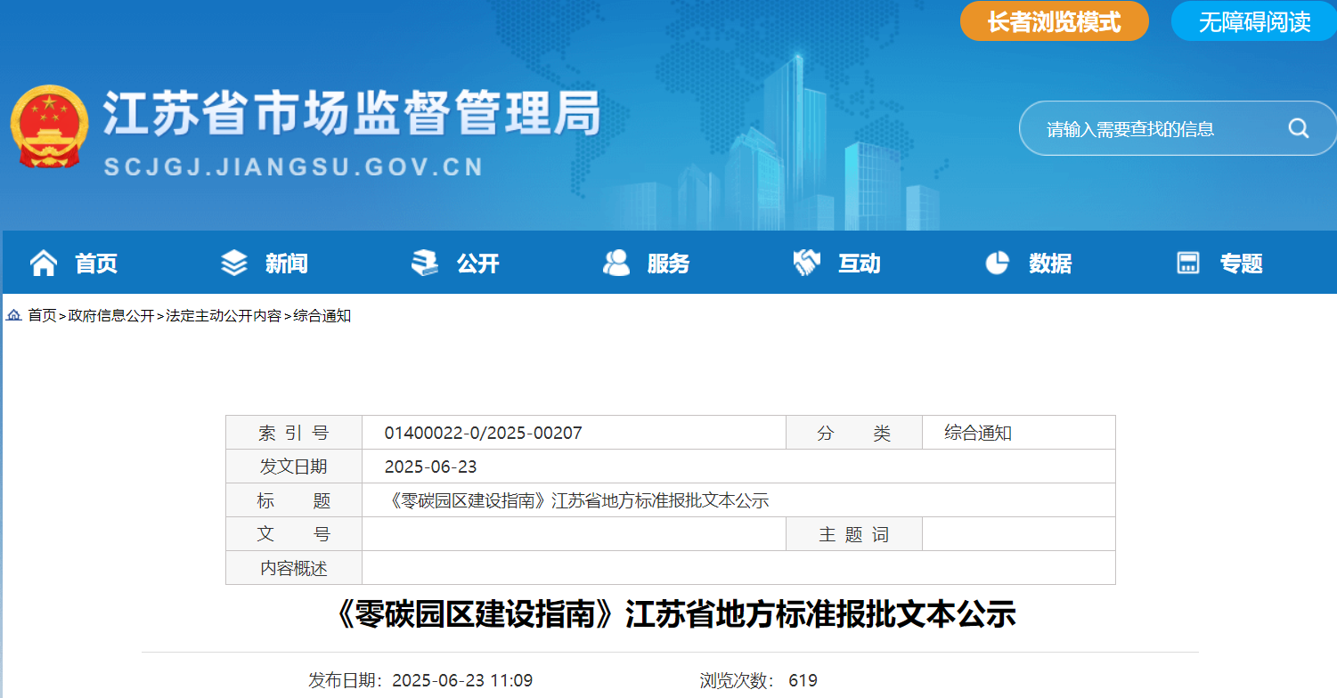 6月23日,江苏省市场监督管理局发布《零碳园区建设指南》江苏省地方标准报批文本公示。公示期为2025年6月23日至2025年7月22日。