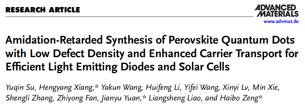 期刊:Advanced Materials题目:Amidation-Retarded Synthesis of Perovskite Quantum Dots with Low Defect Density and Enhanced Carrier Transport for Efficient Light Emitting Diodes and Solar Cells