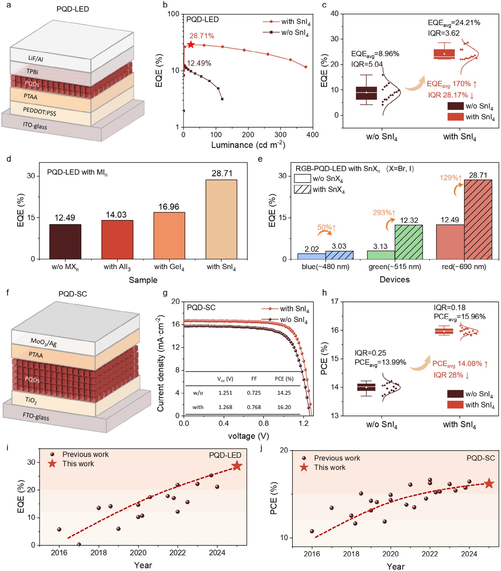 图1. 基于酰胺延迟合成的PQD LED和SC性能提升。a)CsPbI3 PQD LED器件结构示意图。b)基于CsPbI3 PQDs的LED在有无SnI4条件下的EQE。c)基于PQDs的LED在有无SnI4条件下的EQE统计分布。d)不同共价金属碘化物基LED最大EQE的对比。e)基于CsPb(BrCl)3、CsPbBr3和CsPbI3 PQDs的LED在有无SnX4条件下的最大EQE对比。f)CsPbI3 PQD SC器件结构示意图。g)表格中列出了基于CsPbI3 PQD SCs在有无SnI4条件下的电流-电压特性及其他光伏参数。h)基于CsPbI3 PQDs的SCs在有无SnI4条件下的PCE统计分布。i)基于CsPbI3 PQDs的深红(≈690 nm)LED的EQE。j)基于CsPbI3 PQD SCs的PCE。