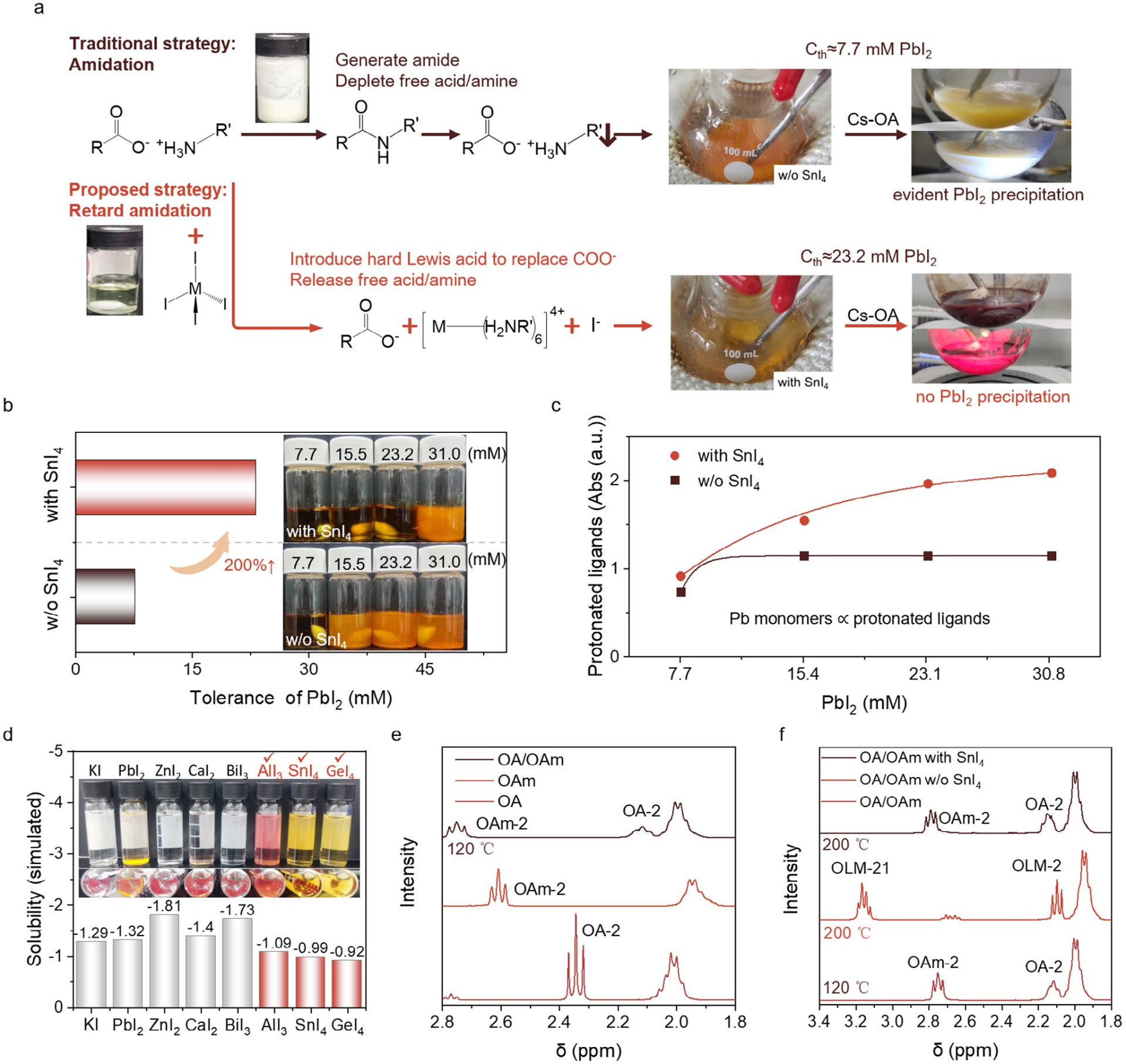图2. 铅X2在酰胺化抑制PQDs合成中的沉淀抑制机制。a)铅前驱体中反应的示意图,有无MIn(M可以是Sn、Al、Ge,以SnI4为例)。b)在200°C溶液中,碘化铅的耐受性及不同样品的照片,有无SnI4的情况。c)不同碘化铅值下,溶液中自由质子化配体的示意图,有无SnI4的情况。d)不同金属卤化物在ODE中的理论溶解度,以及样品的照片。e) 1H NMR谱图显示了OA、OAm和OA/OAm在120°C下的情况。f) 1H NMR谱图显示了OA/OAm(120°C)以及在200°C下,有无SnI4的OA/OAm的情况。