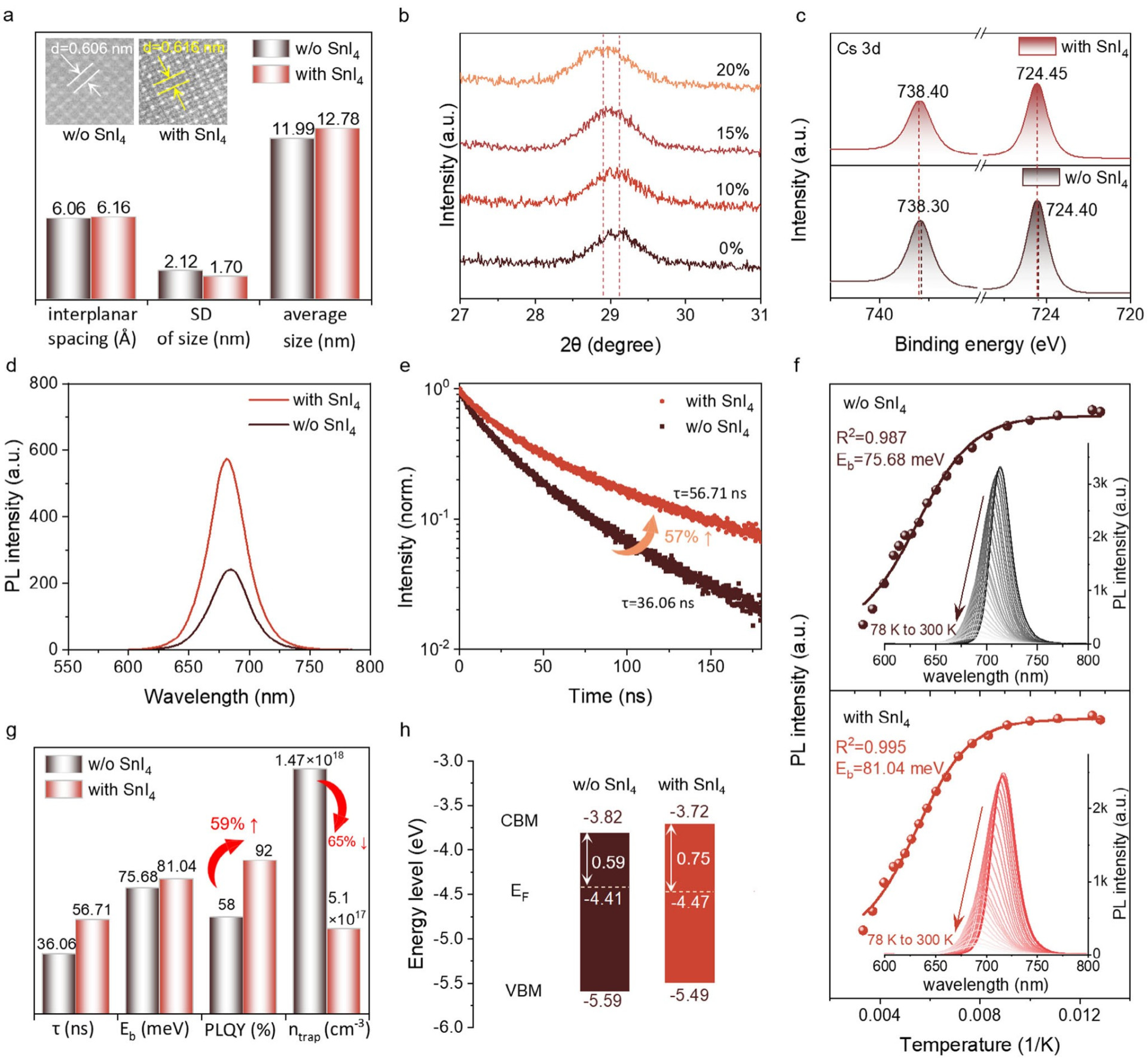 图3. 合成的PQDs的形态、结构、缺陷及光电特性。a)描述了无SnI4和含SnI4的PQDs的STEM参数总结,并附有STEM-HAADF图像。b)不同掺杂比例(0%,10%,15%,20%)的CsPbI3 PQDs的部分XRD图谱。c)高分辨率Cs 3d XPS光谱。d)无SnI4和含SnI4的PQDs的PL光谱。e)经过和未经过SnI4处理的CsPbI3 PQDs的PL衰减曲线。f)原生CsPbI3 PQDs和经SnI4处理的CsPbI3 PQDs的温度依赖性PL强度积分及其Eb拟合曲线(相应的温度依赖性PL光谱已插入)。g)光学性质(τ,Eb,PLQY)的总结。h)有无SnI4的CsPbI3 PQD薄膜的能量级图。
