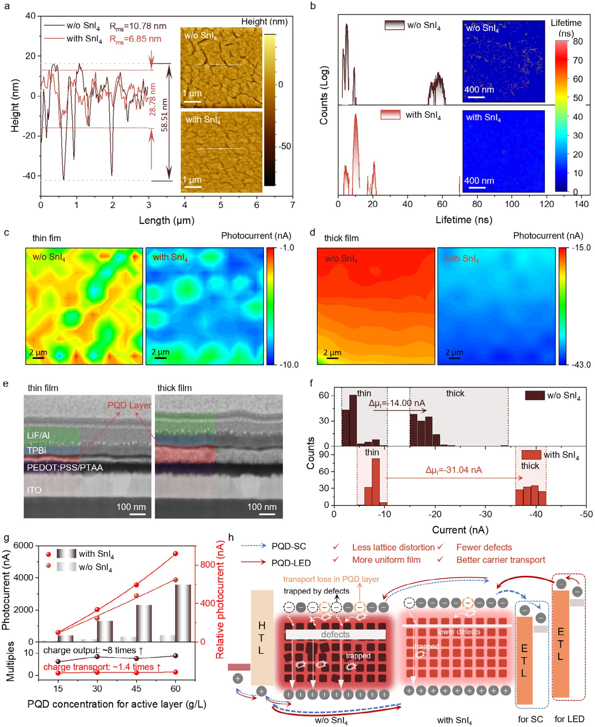图4. 基于氨基化延迟合成的PQD组装薄膜的形态、光学和电子特性。a)未添加和添加SnI4的AFM图像中标记线的高度。b)添加和未添加SnI4的CsPbI3 PQD薄膜寿命分布的统计结果,以及插入的光致发光衰减映射图像。c)未添加和添加SnI4的CsPbI3 PQD薄膜的光电流映射。d)未添加和添加SnI4的CsPbI3 PQD厚膜的光电流映射。e)不同厚度PQDs基LED的截面SEM图像。f)在−1 V时,添加和未添加SnI4的CsPbI3 PQD薄膜的光电流分布统计。g)不同活性层厚度的光电流总结。h)SnI4在PQDs及其相应器件中的作用示意图。