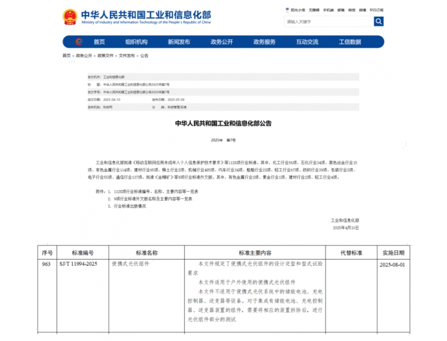 近期,工业和信息化部发布了2025年第7号公告,批准《便携式光伏组件》(SJ/T 11994-2025)等1128项行业标准。作为便携储能全球领导者和全场景家庭绿电开创者,华宝新能(股票代码:301327)牵头制定的《便携式光伏组件》行业标准,首次针对户外便携式光伏组件的设计定型与型式试验提出系统性技术要求,填补了国内细分领域标准化空白。该项标准将于2025年8月1日正式实施,这也标志着我国便携光伏产业将正式进入“标准化发展”新阶段。