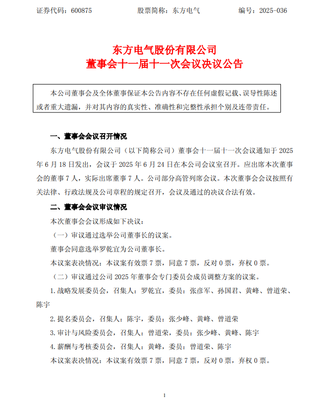6月24日,东方电气(600875)公告称,公司董事会审议通过选举公司董事长的议案。董事会同意选举罗乾宜为公司董事长。
