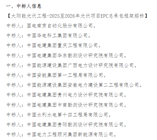 贵州华电2025年至2026年光伏项目EPC总承包招标中标结果公示。项目预估规模约950MW,框架协议期限暂定2025年6月1日至2026年5月31日。中标人12位: