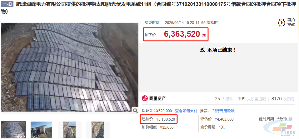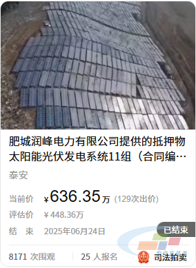 山东省济南市中级人民法院于2025年6月23日10时开始的司法拍卖已于6月24日10时28分结束,拍卖标的为“被执行人肥城润峰电力有限公司提供的抵押物太阳能光伏发电系统11组”。