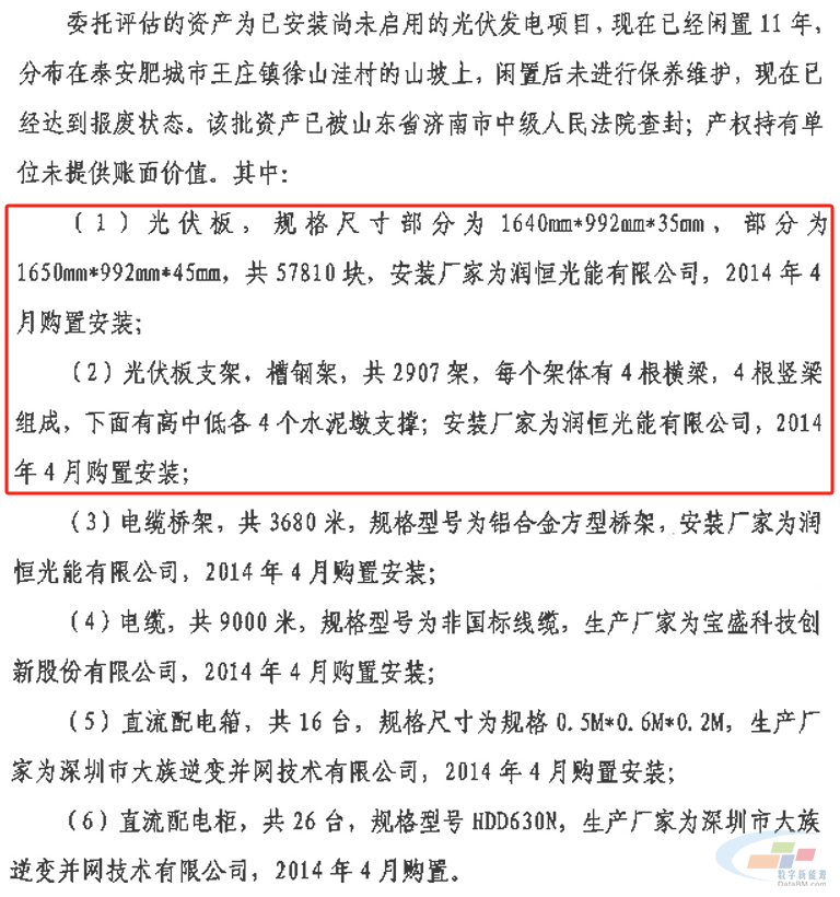 其中拍卖资产包含有光伏板57,810块、光伏支架及槽钢架共计2907架,安装厂家均为润恒光能有限公司,于2014年4月购置安装。