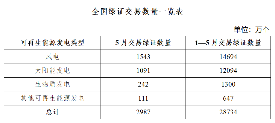 2025年5月,全国交易绿证2987万个,其中绿色电力交易绿证1005万个。2025年1-5月,全国交易绿证2.87亿个,其中绿色电力交易绿证9623万个。(调减1-4月交易绿证数量168万个)
