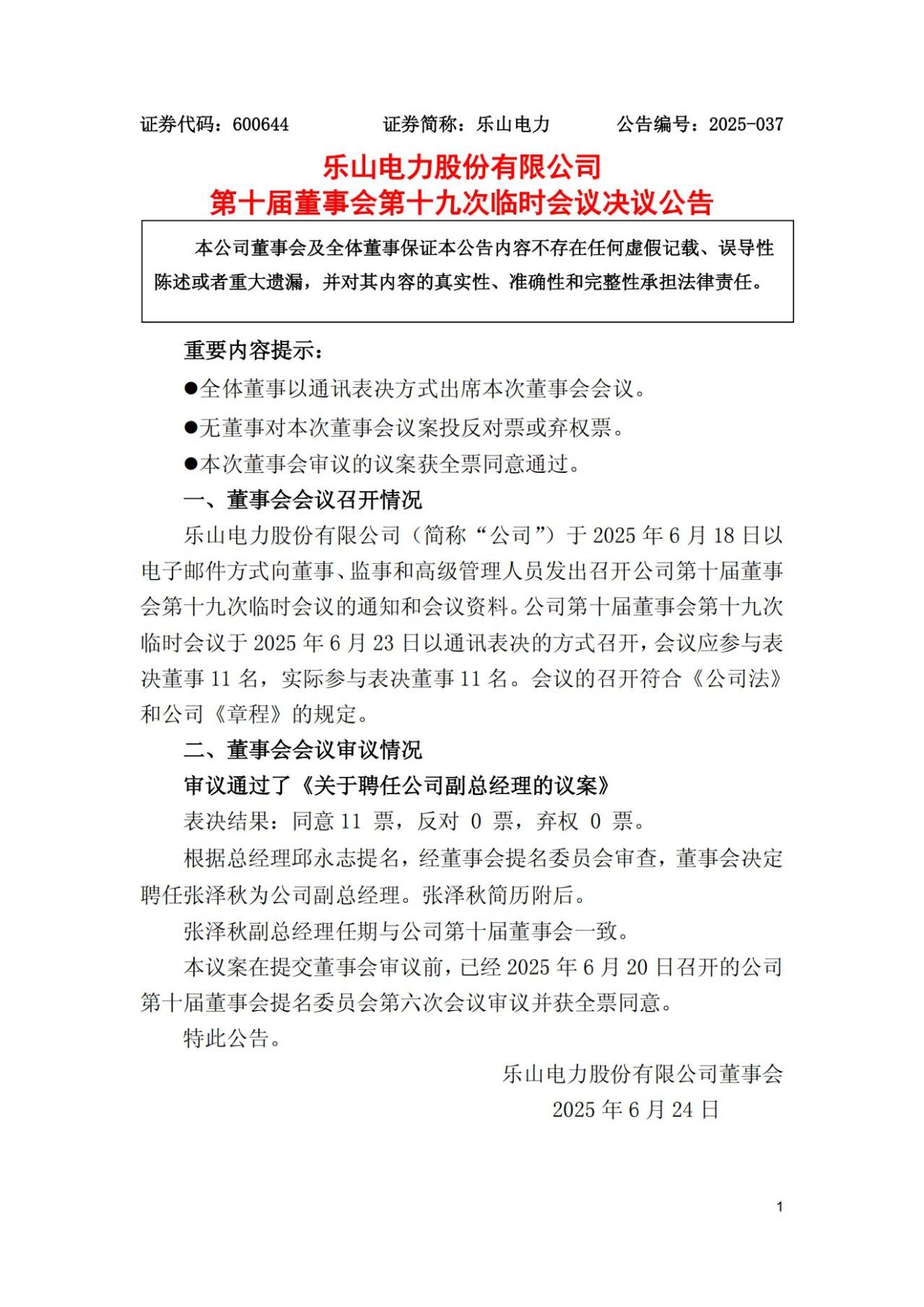 6月24日,乐山电力发布公告称,公司第十届董事会第十九次临时会议于 2025年6月23日以通讯表决的方式召开。董事会审议通过了《关于聘任公司副总经理的议案》表决结果。