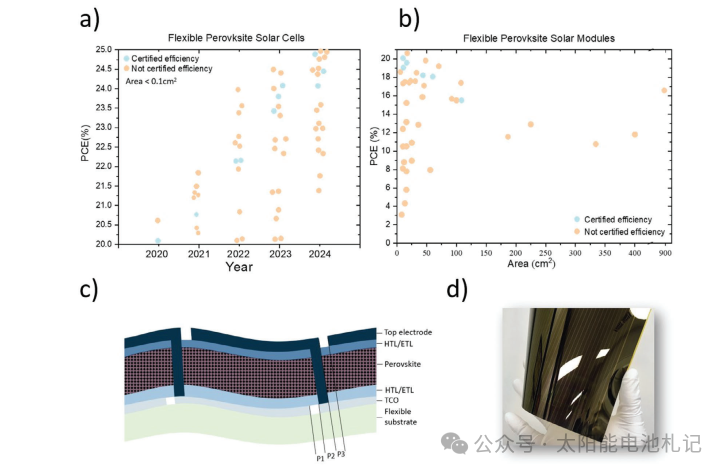特别值得注意的是,在过去三年中(2021-2024),柔性钙钛矿电池的效率从21.7%迅速提升至25.1%,这种增长速度在光伏史上极为罕见。这种快速进步主要得益于对电荷传输层(HTL/ETL)的优化和钙钛矿添加剂的使用,这些添加剂能够填充晶界,改善界面接触,从而提高器件性能。