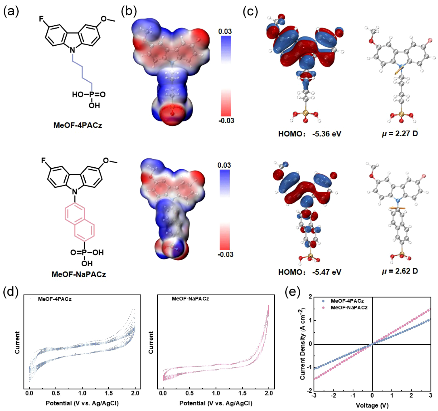 图1. (a) MeOF-4PACz与MeOF-NaPACz的分子结构式。(b) MeOF-4PACz与MeOF-NaPACz的ESP分布图。(c) MeOF-4PACz与MeOF-NaPACz 的HOMO轨道空间分布、分子偶极矩及HOMO能级的计算结果。(d) MeOF-4PACz与MeOF-NaPACz的CV曲线重复性测试(25次循环扫描,扫速100 mV s−1)。(e) 基于J-V曲线法测定的MeOF-4PACz与MeOF-NaPACz薄膜电导率。