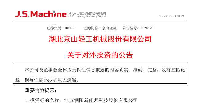 近日,京山轻机(000821.SZ)发布公告,旗下全资子公司苏州晟成光伏设备有限公司(简称“晟成光伏”)拟以现金出资方式对江苏润阳新能源科技股份有限公司(简称“润阳股份”)进行增资,增资总额达1.5亿元。