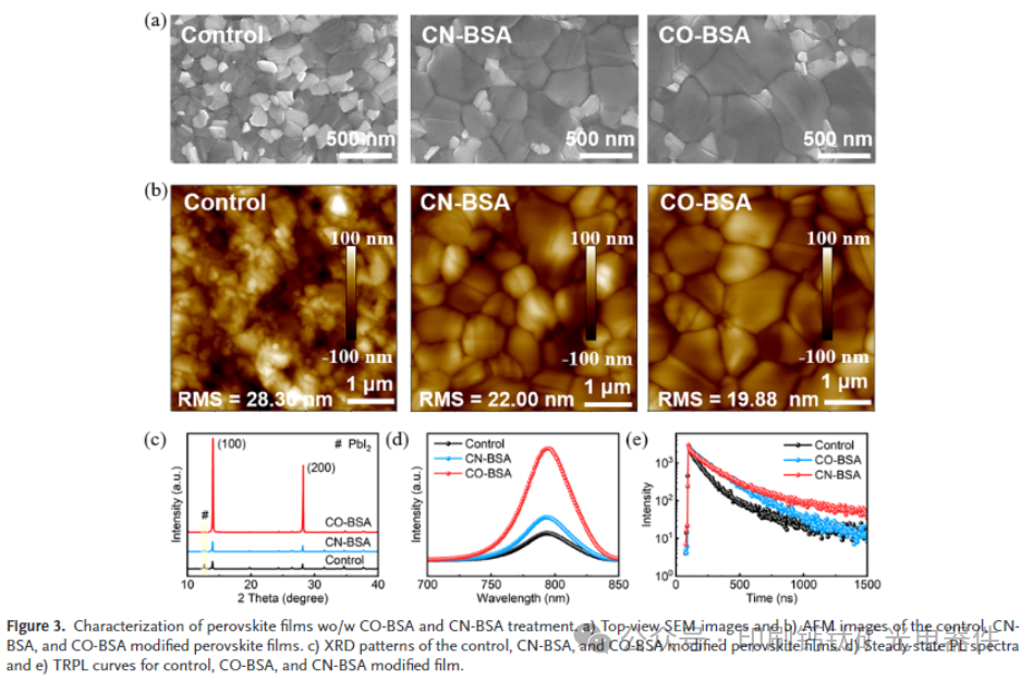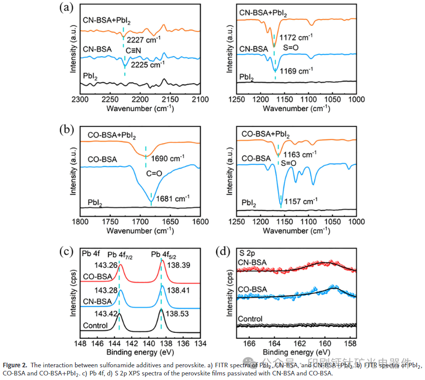 1、新型添加剂设计:首次将 4 - 羧基苯磺酰胺(CO-BSA)和 4 - 氰基苯磺酰胺(CN-BSA)作为分子添加剂引入钙钛矿体系,利用苯环的 π 共轭结构促进电荷传输,并通过磺酰胺基团与 Pb²⁺缺陷形成强配位。