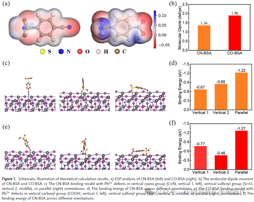 2、双位点钝化机制:发现 CO-BSA 和 CN-BSA 在钙钛矿中优先以平行取向结合,实现对相邻 Pb²⁺缺陷的双位点钝化,其中 CO-BSA 因更高的电子密度和偶极矩表现出更强的配位能力。