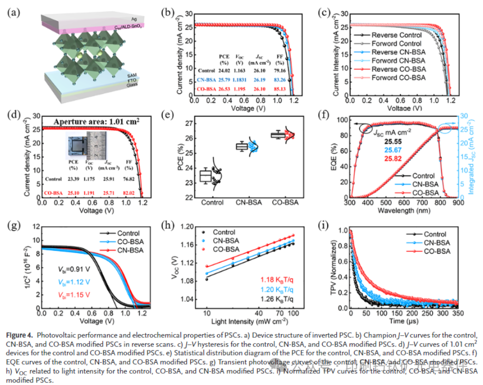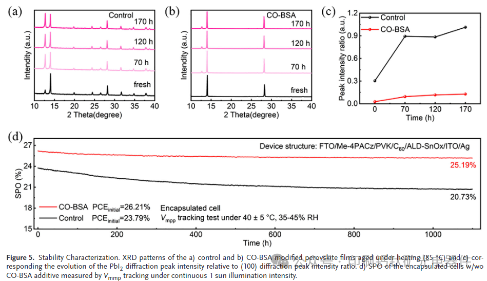 3、性能与稳定性突破:基于 CO-BSA 的 PSCs 实现了 26.53% 的认证效率,且封装器件在 1100 小时稳态测试后仍保留 96.1% 效率,归因于薄膜质量提升、缺陷密度降低及疏水性和热稳定性的增强。