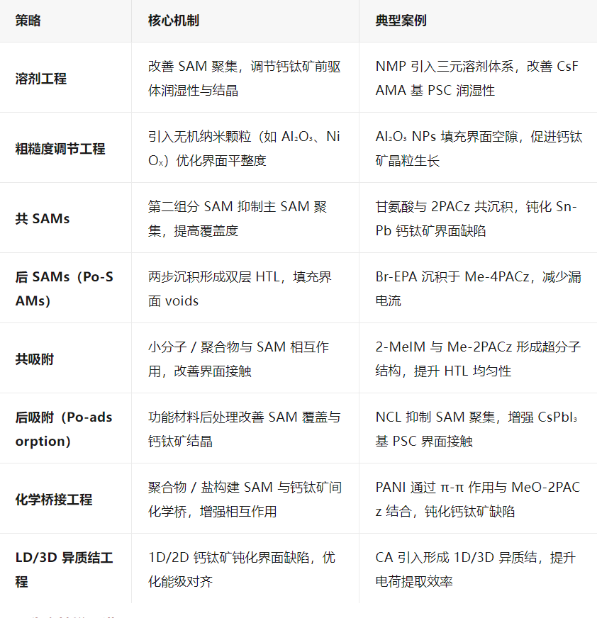 共 SAMs 策略优势第二组分需含亲水基团(如 - NH₂)、具空间位阻,如 6PA、MPA 等,可低成本提升器件性能。