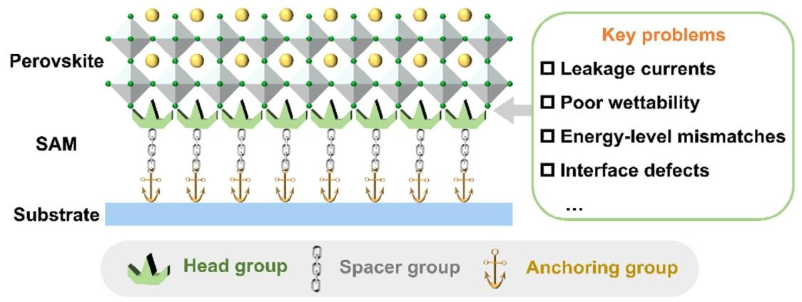 图 1. 自组装单层(SAM)分子结构及基于 SAM 的钙钛矿太阳能电池(PSCs)掩埋界面关键问题示意图