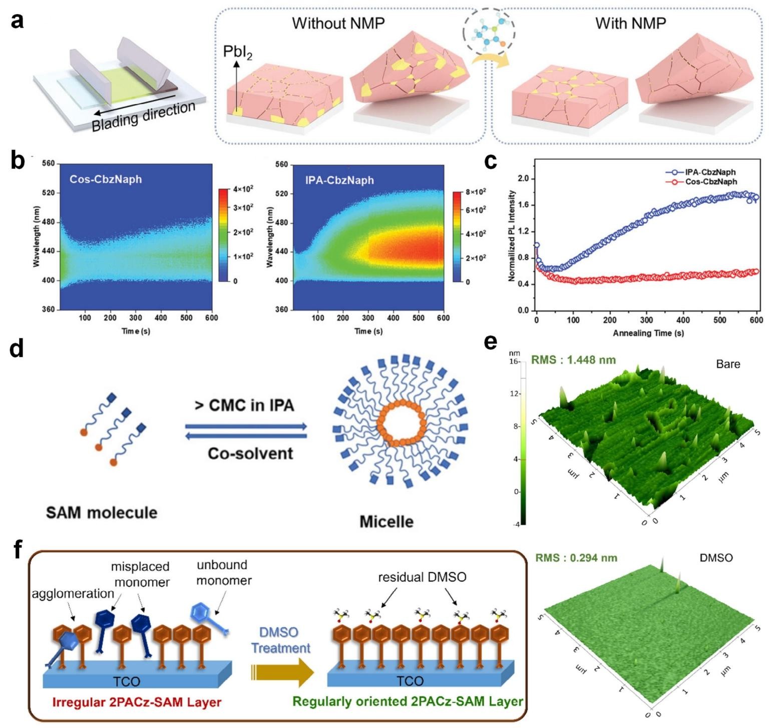 图 2. a) PbI₂分布调制示意图。b) 热退火过程中 IPA-CbzNaph 和 Co-CbzNaph 的原位光致发光(PL)强度演变。c) 热退火时间内的 PL 峰值强度演变。d) 两亲性 SAM 分子形成胶束及在共溶剂中分解的示意图。e) 对照组和 DMSO 处理的 2PACz-SAM 的原子力显微镜(AFM)形貌图像。f) 处理前不均匀的 2PACz-SAM 分子排列及处理后重新取向的示意图。