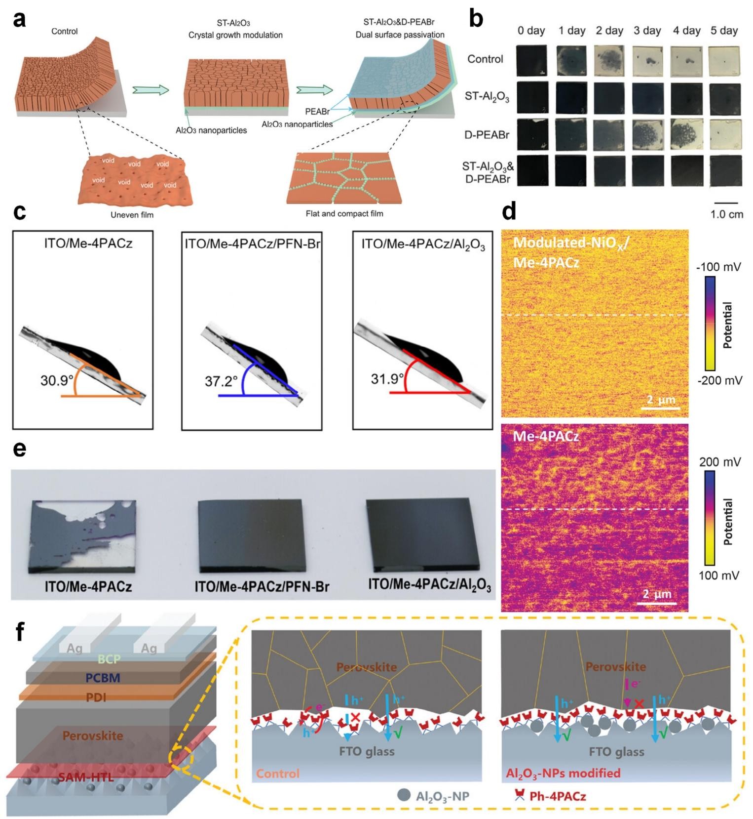 图 3. a) 器件结构示意图:对照组薄膜、含 Al₂O₃纳米颗粒的空穴传输层(ST-Al₂O₃),以及结合 Al₂O₃纳米颗粒和 PEABr 的空穴传输层(ST-Al₂O₃&D-PEABr)。b) 对照组、ST-Al₂O₃、D-PEABr 和 ST-Al₂O₃&D-PEABr 薄膜在 98±1% 湿度下老化 5 天的光学图像。c) 钙钛矿溶液在 ITO/Me-4PACz、ITO/Me-4PACz/PFN-Br 和 ITO/Me-4PACz/Al₂O₃上的滚落角测量结果。d) Me-4PACz 和调制后的 NiOₓ/Me-4PACz 的表面电势 KPFM 图像。e) 照片显示裸露 Me-4PACz 对钙钛矿的润湿性差,以及 PFN-Br/Al₂O₃修饰后润湿性的改善。f) 含或不含 Al₂O₃纳米颗粒的掩埋界面示意图。