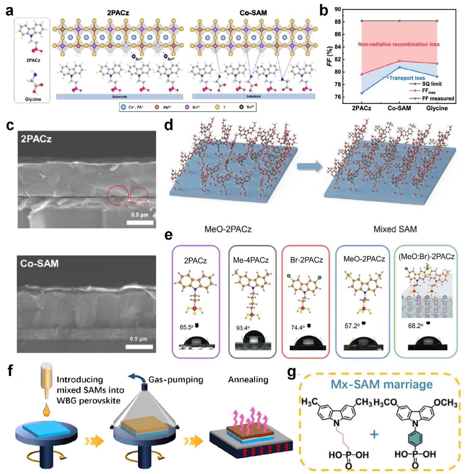 图 4. a) 涂覆在 ITO/2PACz 和 ITO / 共 SAM 上的 Sn-Pb 钙钛矿薄膜的晶格结构示意图。b) 含 2PACz、共 SAM 和甘氨酸的器件的填充因子(FF)损失分析。c) 涂覆在 ITO/2PACz(上)和 ITO / 共 SAM(下)上的钙钛矿薄膜的横截面扫描电子显微镜(SEM)图像。d) 沉积在 ITO 上的 MeO-2PACz 和混合 SAM 的薄膜结构示意图。e) SAM 分子的化学结构及其水接触角。f) 通过共沉积钙钛矿和优化混合比例的 SAMs 实现宽带隙(WBG)钙钛矿沉积过程的示意图。g) Mx-SAM 的分子结构(左:Me-4PACz,右:MeO-PhPACz)。