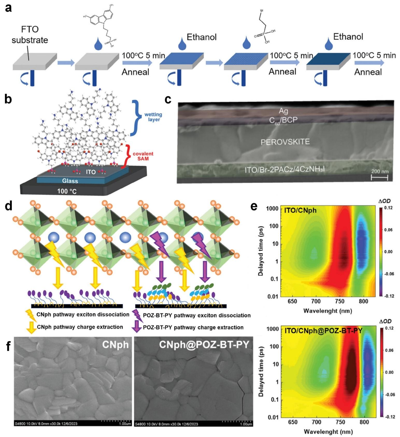 图 5. a) 后自组装单层(po-SAMs)沉积过程示意图。b) 自组装双层(SAB,SAM + 润湿层)结构示意图。c) 目标器件结构的横截面扫描电子显微镜(SEM)图像。d) SAM@准平面结构的作用机制示意图。e) 钙钛矿在 CNph 和 CNph@POZ-BT-PY 包覆的氧化铟锡(ITO)上的皮秒瞬态吸收(ps-TA)光谱二维伪彩色图。f) 钙钛矿在 CNph 和 CNph@POZ-BT-Py 上的表面形貌 SEM 图像。