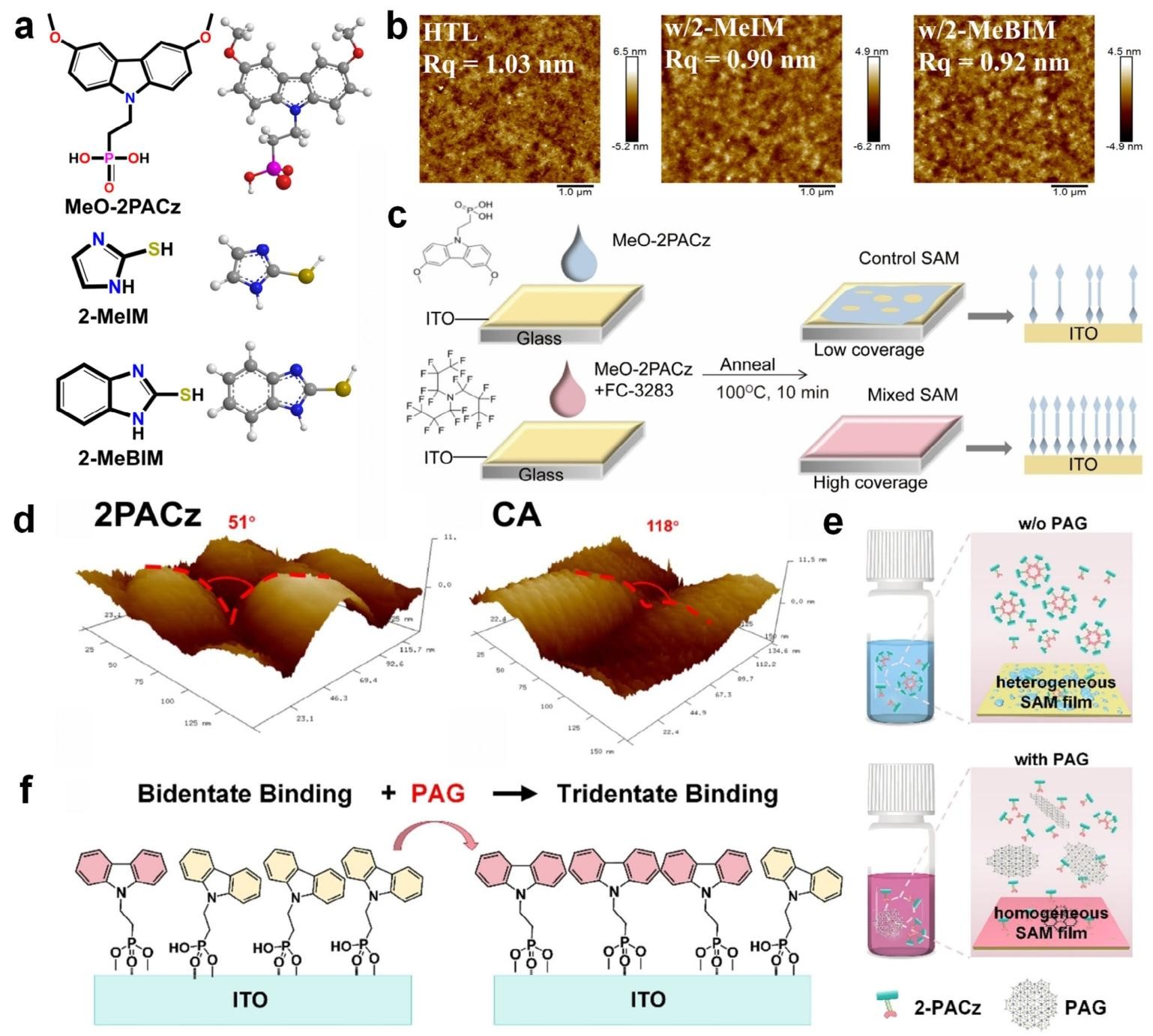 图 6. a) MeO-2PACz、2-MeIM 和 2-MeBIM 的分子结构与球棍模型。b) 含添加剂与不含添加剂的相应薄膜的表面粗糙度。c) 对照组与混合 SAM 的示意图。d) 2PACz 基钙钛矿薄膜与共吸附(CA)基钙钛矿薄膜的掩埋界面高分辨率原子力显微镜(AFM)图像,晶界沟槽角度估计分别为 51° 和 118°。e) PAG 共吸附前后 2-PACz 的自组装示意图。f) PAG 共吸附前后 2-PACz 的示意图。