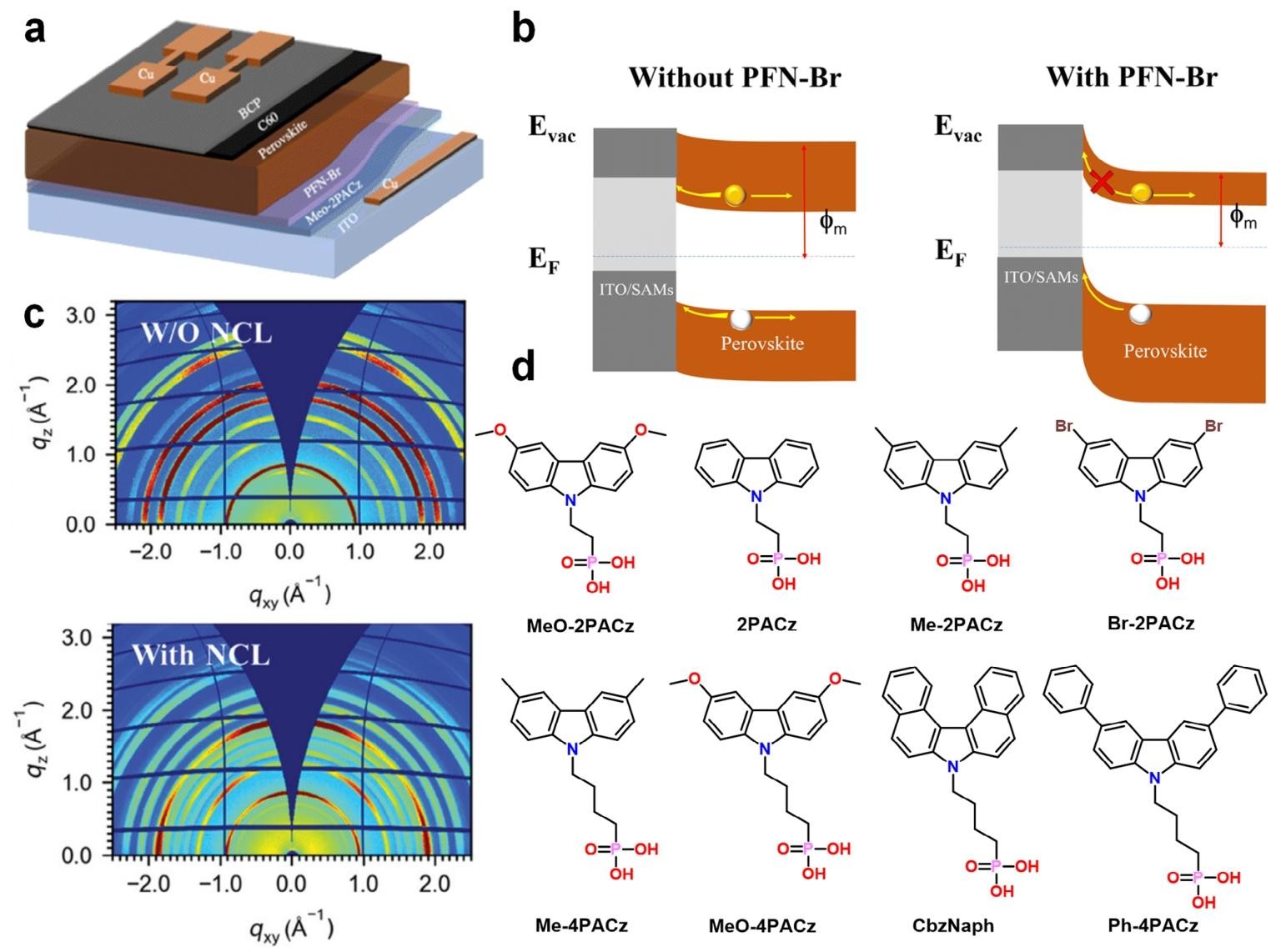 图 7. a) 目标钙钛矿太阳能电池(PSCs)的器件结构。b) 示意图展示了钙钛矿薄膜在 ITO/MeO-2PACz 和 ITO/MeO-2PACz/PFN-Br 基底上的表面电势能带图。c) 对照组和 NCL 处理的钙钛矿(PVK)薄膜的掠入射广角 X 射线散射(GIWAXS)图像。d) PACz 衍生的自组装单层(SAMs)的分子结构。