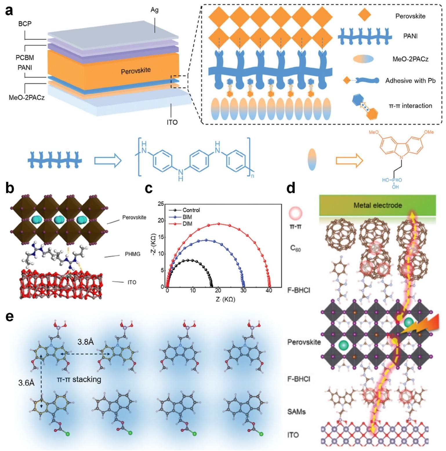 图 8. a) 导电粘合剂(PANI)的相互作用机制示意图。b) 展示 PHMG 内聚效应的示意图。c) 对照组、掩埋界面调制(BIM)和双界面调制(DIM)钙钛矿太阳能电池(PSCs)的奈奎斯特图。d) 整体设计方法的图示。F-BHI 封端的钙钛矿与 C60 和 Me-2PACz 均形成良好连接。红色光晕表示 π-π 相互作用;浅黄色虚线代表载流子传输路径。e) 9-YT 中官能团与 MeO-2PACz 之间 π-π 相互作用的示意图。