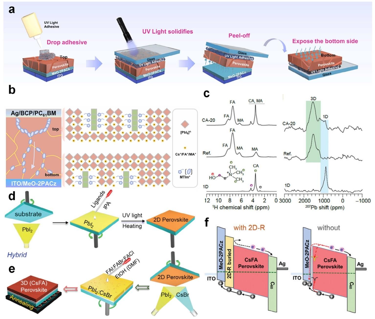图 9. a) 钙钛矿薄膜剥离方法示意图。b) MTIm 渗透晶界并在双界面形成 1D 钙钛矿的示意图。c) CA-20、参比物和 1D 组分的固态 1D NMR 光谱(I¹H/²⁰⁷Pb)。在 ²⁰⁷Pb 光谱中,绿色竖条表示对应 3D 钙钛矿的 ²⁰⁷Pb 峰,蓝色条带突出显示 1D 组分。d) 使用配体 4 - 乙烯基苄基铵(VBA)在掩埋界面进行 2D 钙钛矿混合两步法处理的示意图。请注意,UV 处理结合热加热可诱导交联 (VBA)₂PbI₄的形成。e) 通过在 2D 钙钛矿上沉积 3D 钙钛矿形成 2D/3D 双层异质结构的示意图。f) 含和不含 2D-R 钙钛矿器件的载流子传输机制示意图。