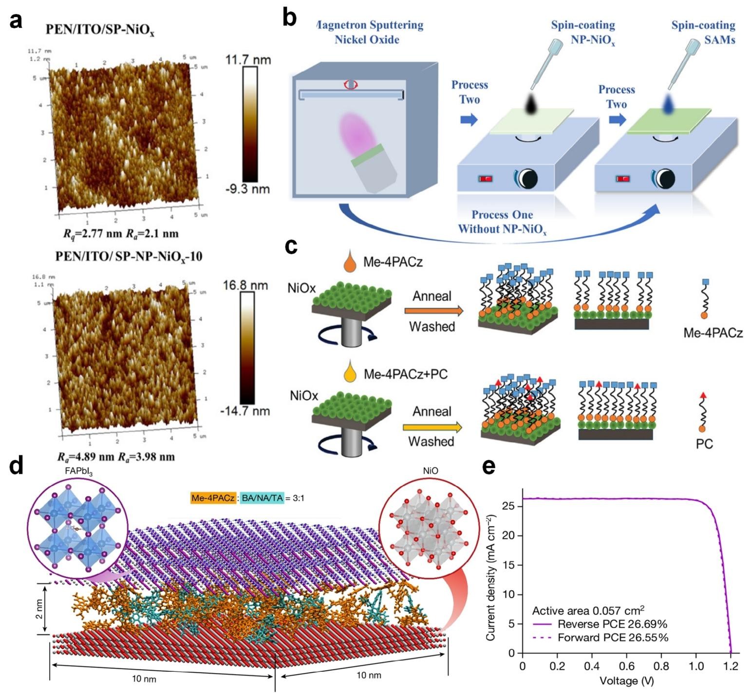 图 10. a) PEN/ITO/SP-NiO 和 PEN/ITO/SP-NP-NiO 10(NP-NiOₓ浓度 = 10 mg・mL⁻¹)的原子力显微镜(AFM)图像。b) 含或不含 NP-NiO 的空穴传输层(HTLs)制备工艺示意图。c) 修饰 NiOₓ上的 SAM(Me-4PACz)和共 SAMs(Me-4PACz + PC)的示意图。d) 用于分子动力学模拟的钙钛矿 / SAM/NiO/SAM/NiOₓ异质结模型图示。e) 含 NA-Me 混合表面层(HSL)的冠军倒置 PSC 在正向和反向扫描时的 J–V 曲线。