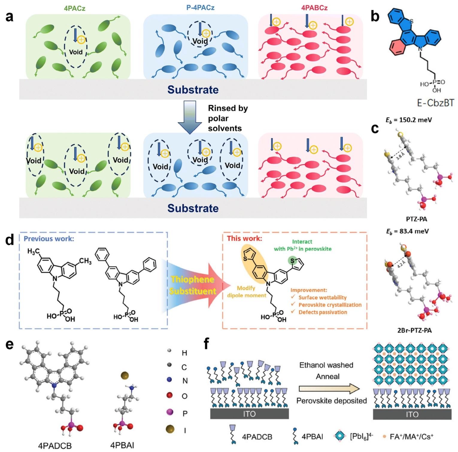 图 11. a) 4PACz、P-4PACz 和 4PABCz 多层结构及其提出的空穴传输机制示意图。b) E-CbzBT 的分子结构。c) PTZ-PA 和 2Br-PTZ-PA 的分子间距离计算(键长单位为埃)d) 具有不同取代基的 SAM 分子的化学结构。e) 4PADCB 和 4PBAI 的球棍模型。f) ITO / 共 SAMs 薄膜的制备示意图。