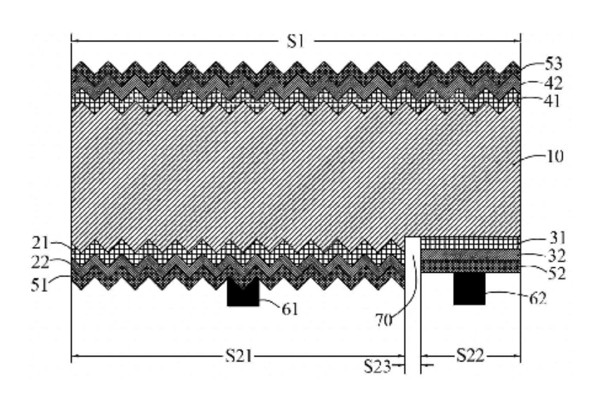 摘要:本发明揭示了一种HBC电池及其制备方法,所述HBC电池包括:硅片;异质结构,包括层叠于第一区域上的第一钝化层及第一掺杂层;第一电极结构,位于异质结构中的第一掺杂层上;第一钝化结构,包括层叠于第二区域上的第二钝化层及第二掺杂层;第二电极结构,位于第一钝化结构中的第二掺杂层上;第二钝化结构,位于硅片的第一表面上;隔离结构,包括位于隔离区上的隔离槽。本发明的HBC电池叠加了HJT电池和IBC电池的优势,正面和背面均采用钝化结构降低表面复合率,钝化效果好,能够显著提升光电转换效率;本发明中采用激光工艺对掩膜进行图形化开膜,无需额外增加光刻设备,简化了工艺步骤,提高了产品良率,降低了工艺成本。