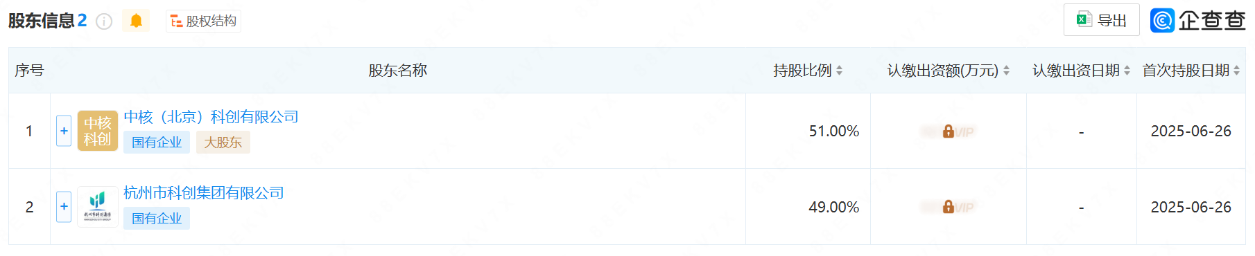 6月26日,中核(浙江)科创有限公司成立。企查查信息显示,该公司为中核(北京)科创有限公司、杭州市科创集团有限公司合资成立。其中,中核(北京)科创有限公司持股比例51%。