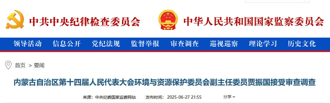 中央纪委国家监委网站6月27日消息,据内蒙古自治区纪委监委消息:内蒙古自治区第十四届人民代表大会环境与资源保护委员会副主任委员贾振国涉嫌严重违纪违法,目前正接受内蒙古自治区纪委监委纪律审查和监察调查。