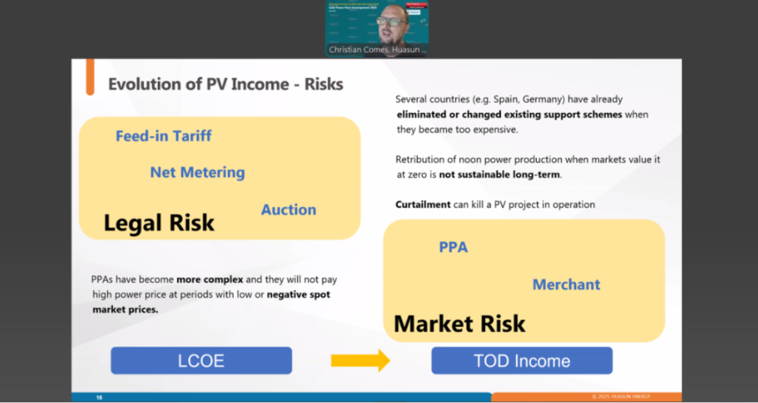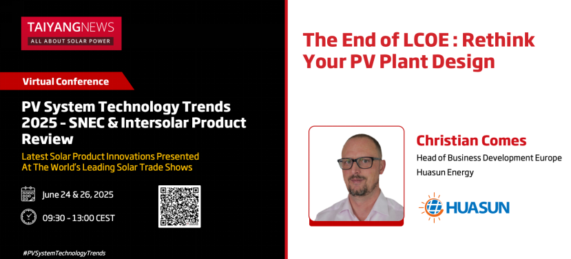 6月26日,由光伏行业权威媒体TaiyangNews主办的“2025年全球光伏系统技术趋势”线上会议(Global PV System Technology Trends 2025)圆满落幕。华晟新能源欧洲业务开发总监Christian Comes受邀出席并发表了题为《异质结垂直安装重新定义光伏电站设计(Rethink Your PV Plant Design with HJT Vertical)》的专题演讲,系统阐述了基于度电成本(LCOE)的传统收益模式的电站可能面临的问题,并提出了以昆仑异质结垂直组件为核心,构建分时段价值(TOD,Time-of-Day)优先的新一代华晟电站收益体系。