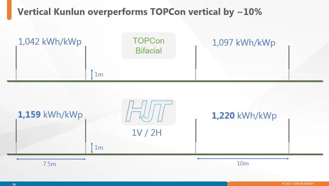 为应对这一挑战,华晟提出更具前瞻性的“异质结+垂直安装”解决方案,通过技术创新实现价值重构。独特的垂直安装方式实现了双峰发电,使发电高峰精准匹配早晚电价高峰;采用0BB电池技术,结合近100%的双面率,显著提升发电量;更少占地面积,提升土地综合收益;无边框与薄边框的灵活设计适配不同安装场景;优异的抗热斑、抗冰雹能力,在严苛环境中显著提升系统可靠性,全面助力全生命周期收益最大化。