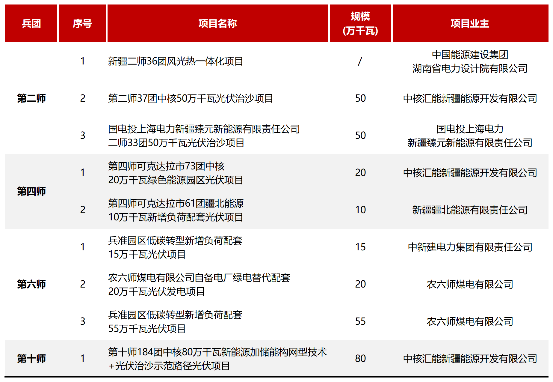 近日,新疆兵团第二师、第四师、第六师、第十师发布移出兵团市场化并网新能源项目清单的公示。根据文件,四个师合计9个项目移出市场化并网新能源项目清单,项目合计容量超3GW,项目业主包括中国能建、中核、国家电投等电力央企以及疆北能源、中新建电力、农六师煤电等地方国企。