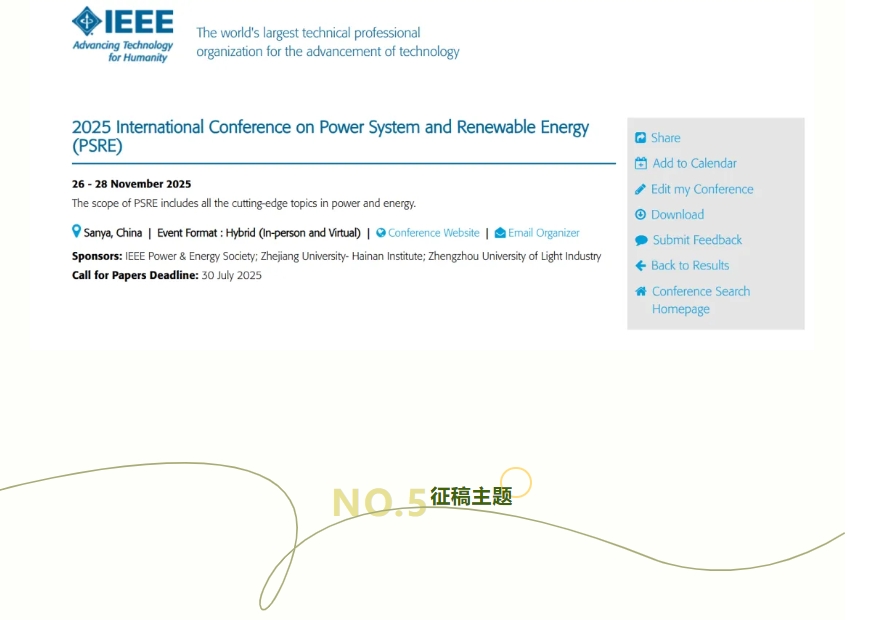 海南省位于中国最南端,拥有丰富的水、热、风、光等可再生能源资源,且从2025年元月开始自由贸易港运作,对多个国家的公民免予签证。为促进海南省电力与能源领域的科学研究、技术开发和产学研融合,拟计划于 2025年11月26-28日在三亚举行2025年电力系统与可再生能源国际会议。