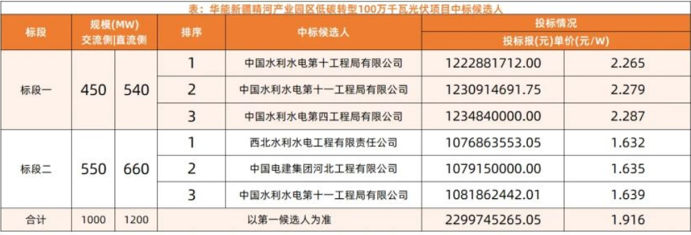 6月30日,华能新疆公司南疆分公司精河产业园区低碳转型100万千瓦光伏项目施工和设备打捆采购工程项目中标候选人公示。项目位于新疆维吾尔自治区博尔塔拉蒙古自治州精河县,规划光伏容量1000MW,直流侧装机容量为1200.01518MWp,为草光互补项目。从结果看,两个标段的第一中标人:中国水利水电第十工程局有限公司、西北水利水电工程有限责任公司,均为中国电建集团下属公司。