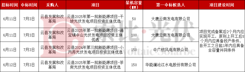 7月3日,云南云县2025年第一批新能源项目4个光伏项目投资主体优选候选人公示,4个光伏项目规模共计450MW。