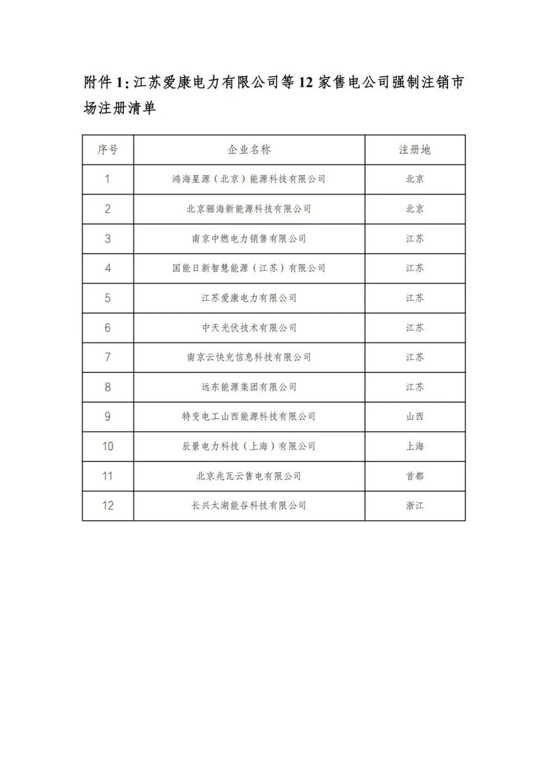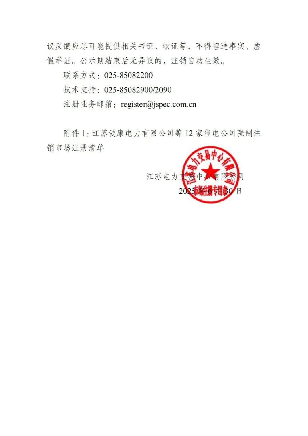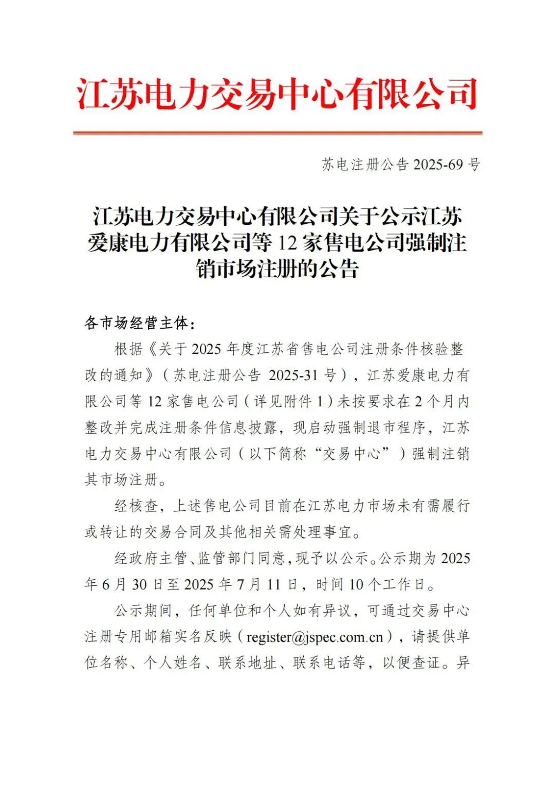 据了解,根据《关于2025年度江苏省售电公司注册条件核验整改的通知》(苏电注册公告 2025-31号),江苏爱康电力有限公司等12家售电公司(详见附件1)未按要求在2个月内整改并完成注册条件信息披露,现启动强制退市程序,江苏电力交易中心有限公司(以下简称“交易中心”)强制注销其市场注册。
