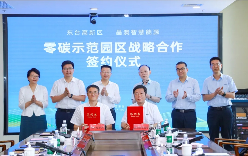 7月5日上午,晶澳智慧能源与东台高新区零碳园区战略合作签约仪式举行,双方将重点围绕清洁能源、资源循环化利用等领域深化合作,致力打造国家级零碳园区标杆。盐城市副市长、东台市委书记商建明,晶澳科技董事长靳保芳出席并见证签约。晶澳智慧能源BG总裁施俊代表我方签约。