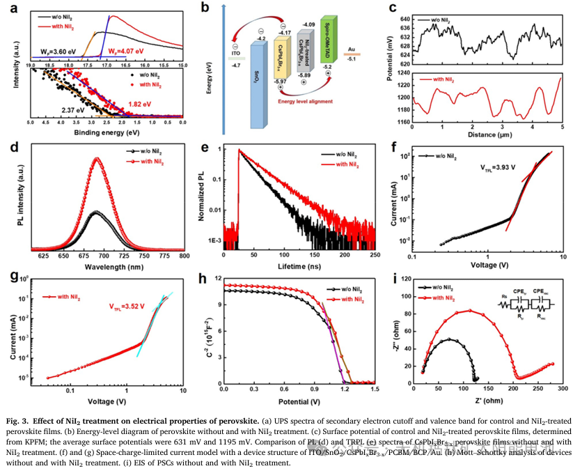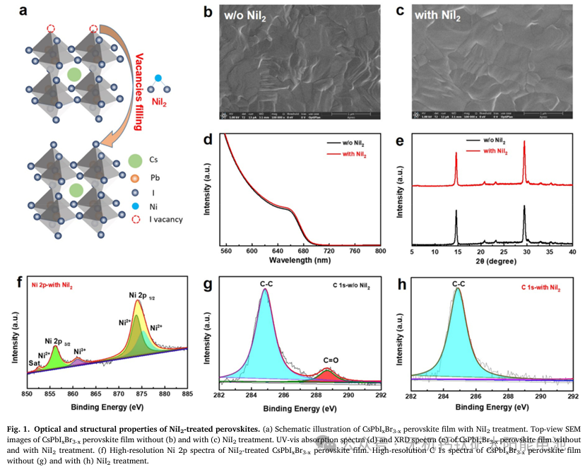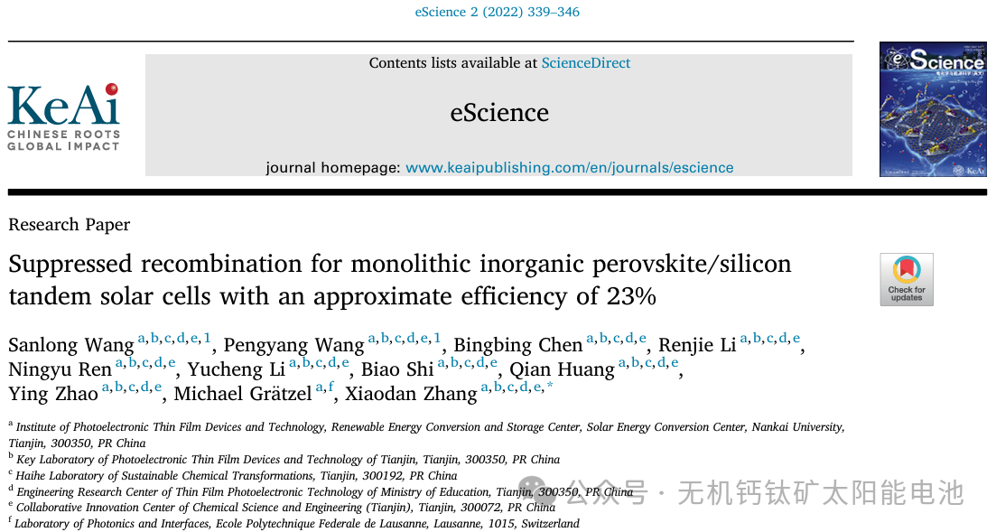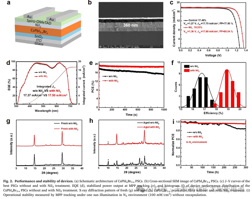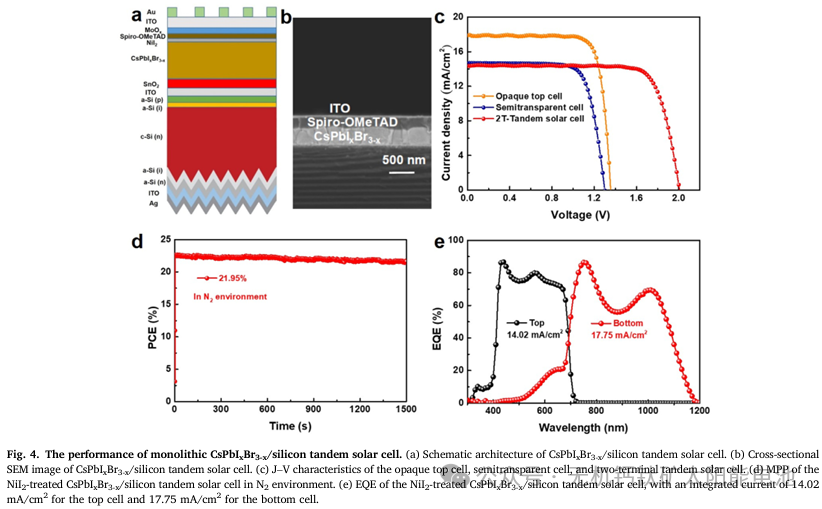 潜在的耐高温无机钙钛矿/硅串联太阳能电池(TSC)是有望突破单结硅电池效率极限的器件。然而,不良的非辐射复合通常会导致显著的电压损失。鉴于此,2022年6月28日南开大学Xiaodan Zhang等于eScience发文,提出一种有效的策略,使用无机卤化物盐碘化镍来钝化碘空位并抑制非辐射复合。经碘化镍处理的带隙为1.80eV的CsPbI3-xBrx无机钙钛矿太阳能电池的效率达到19.53%,电压为1.36V,对应的电压损失为0.44V。重要的是,处理后的器件表现出出色的运行稳定性,在氮气氛围中连续光照下进行最大功率点跟踪300小时后,仍能保持其初始效率的95.7%。通过将这种无机钙钛矿顶电池与带隙较窄的硅底电池相结合,首次实现了单片无机钙钛矿/硅串联太阳能电池,其效率达到22.95%,开路电压为2.04V。这项工作为利用无机钝化材料实现高效稳定的太阳能电池提供了一种有前景的策略。