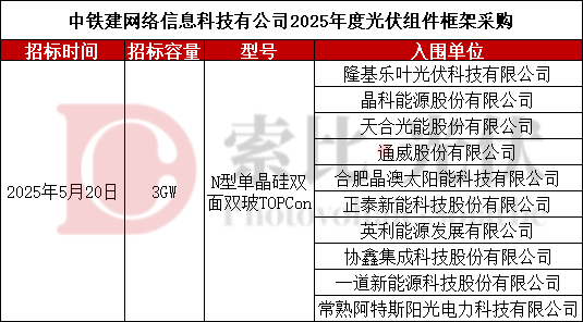 7月9日,中铁建网络信息科技有限公司2025年度光伏组件框架采购评标结果公示。预估采购总量3GW,光伏组件工艺为N型单晶硅双面双玻TOPCon,有效期至2025年12月31日。