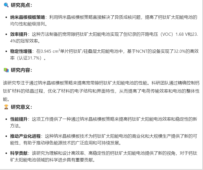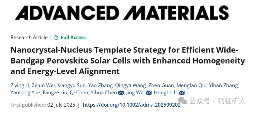 基于此,北京理工大学李红博等人开发了一种纳米晶-核模板 (NCNT) 策略,通过精确匹配纳米晶体的 I/Br 比与目标钙钛矿薄膜的 I/Br 比,直接解决异质成核——相分离的根本原因。这种方法指导 Pb-I/Br 八面体的均质组装,实现 WBG 薄膜出色的卤化物均匀性和精确的结晶控制。NCNT 同时诱导 p 型掺杂并降低钙钛矿/C60 界面能垒,显着增强电荷提取。值得注意的是,通过这种方法制造的 1.68 eV WBG PSC 实现了创纪录的 1.30 V 开路电压 (VOC),同时具有 23.4% 的冠军效率。该策略的广泛适用性在 1.63-1.76 eV 的宽带隙范围内得到证明,所有带隙均表现出 (001) 优取的方向和出色的光稳定性。当集成到 0.945 cm2 单片钙钛矿/硅叠层太阳能电池中时,基于 NCNT 的器件可提供 32.0% 的高效率(认证 31.7%)。这项工作强调了纳米晶体在调节钙钛矿结晶中的关键作用,解决了 WBG 钙钛矿中长期存在的 VOC 限制,并为下一代光电器件和串联光伏建立了一个可扩展的平台。该论文近期以“Nanocrystal-Nucleus Template Strategy for Efficient Wide-Bandgap Perovskite Solar Cells with Enhanced Homogeneity and Energy-Level Alignment”为题发表在顶级期刊Advanced Materials上。