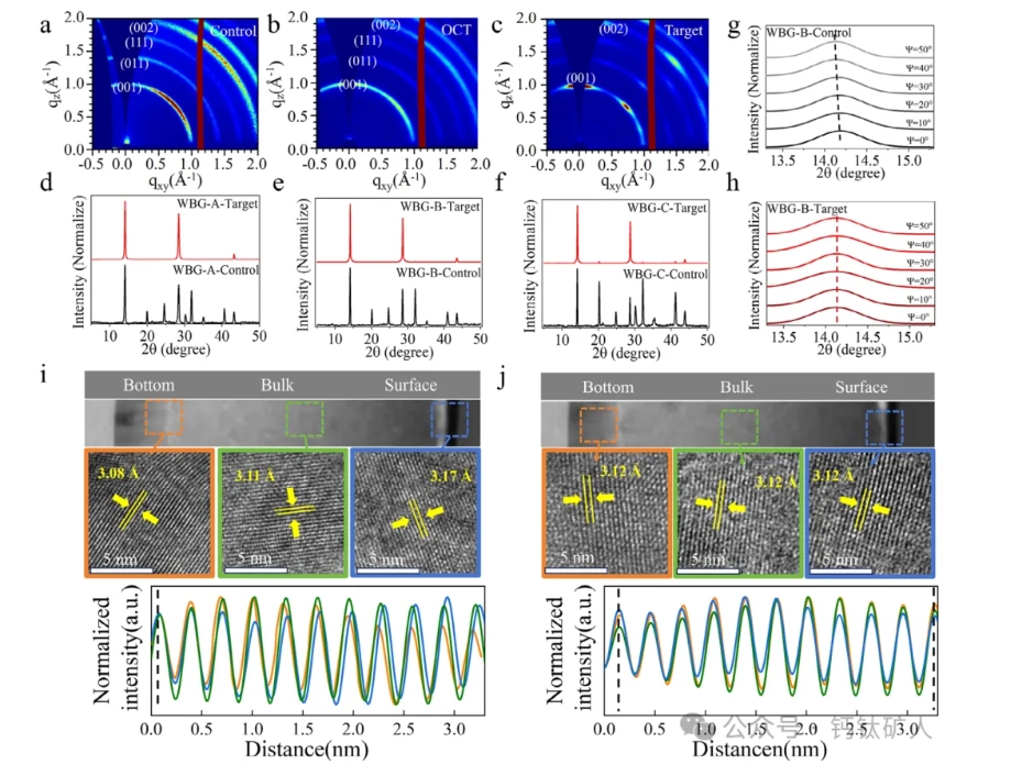 图1. NCNT策略提高了钙钛矿薄膜的质量。a-c)使用CB、OCT和OCT-NC处理制备的膜的GIWAXS图案。d-f)三种宽带隙钙钛矿膜:WBG-A、WBG-B和WBG-C的XRD图案。g,h)从0°到50°扫描的对照和目标WBG-B膜的GIXRD图案。i,j)从底部、中心和表面区域比较对照和目标组的HRTEM图像。