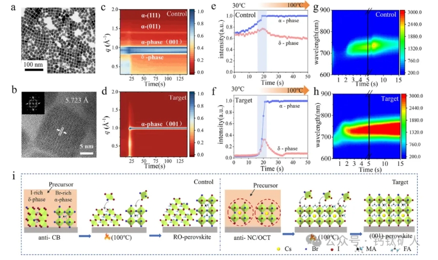 图2. 通过NCNT策略实现的结晶过程的分析。a)CsPb(I0.74Br 0.26)3 NCs的TEM图像。B)(a)中所示的NC的HRTEM图像和相应的傅立叶变换图案。c-f)对照组和目标组的薄膜的原位GIWAXS图案和相应的的强度分布。g,h)对照组和实验组的膜的原位PL光谱i)钙钛矿结晶过程的示意图。
