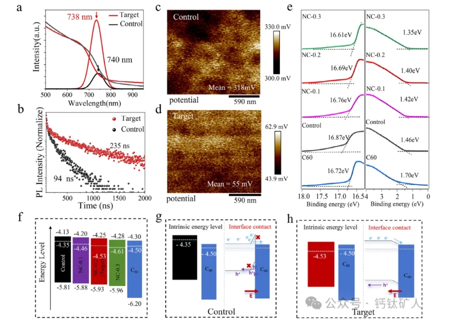 图3. 钙钛矿膜的光电性质。a)紫外-可见吸收和光致发光(PL)光谱,B)时间分辨光致发光(TRPL)光谱,和c,d)对照组和目标组的开尔文探针力显微镜(KPFM)图像。e)C60、对照膜和用0.1 mg mL-1的NC浓度制备的膜的紫外光电子能谱(UPS)结果(NC-0.1)、0.2 mg mL−1 NC-0.2(目标)和0.3 mg mL−1 f)从UPS导出的费米能级(EF)、价带最大值(VBM)和导带最小值(CBM)的结果为(e)。h)对照组和靶组的膜中电子和空穴传输的示意图。在异质结界面处的电场矢量中。