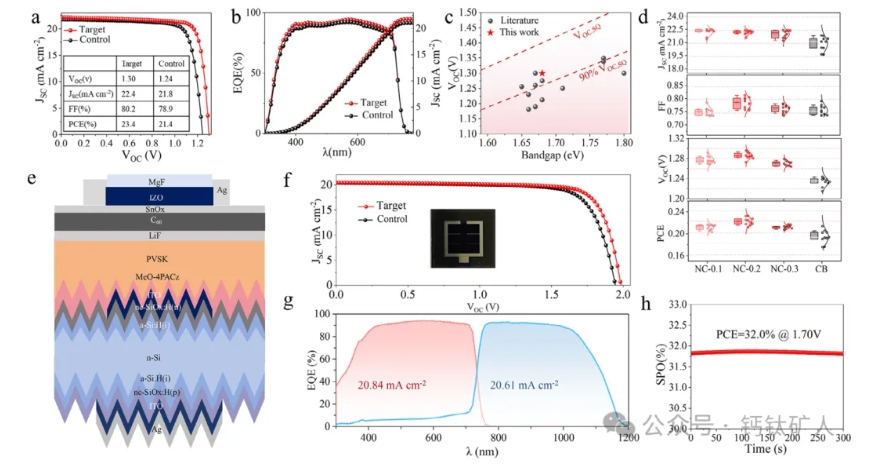 图4. 器件性能表征。a)目标组和对照组具有1.68 eV带隙的器件的冠军功率转换效率(PCE)。B)目标组和对照组的器件的EQE。c)具有不同带隙的代表性PSC的报告VOC值的总结。d)对照组和具有不同NC浓度的目标组的10个器件的统计性能分布(0.1、0.2和0.3 mg mL-1)。e)钙钛矿/硅叠层太阳能电池的器件结构示意图。f)钙钛矿/硅叠层太阳能电池的冠军PCE。g)钙钛矿/硅串联太阳能电池的EQE光谱。h)钙钛矿/硅串联太阳能电池的SPO。